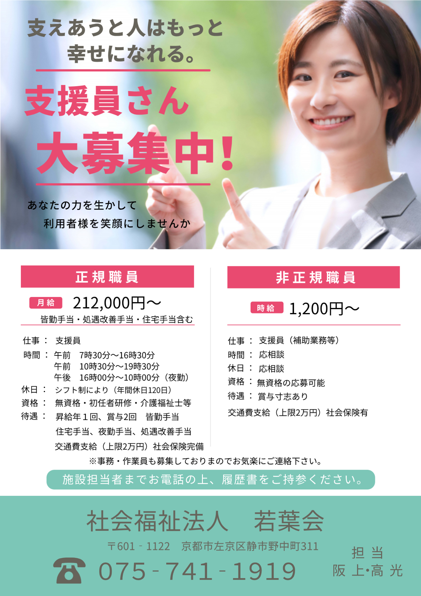 担当者までお電話の上、履歴書をご持参ください。お待ちしています。